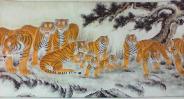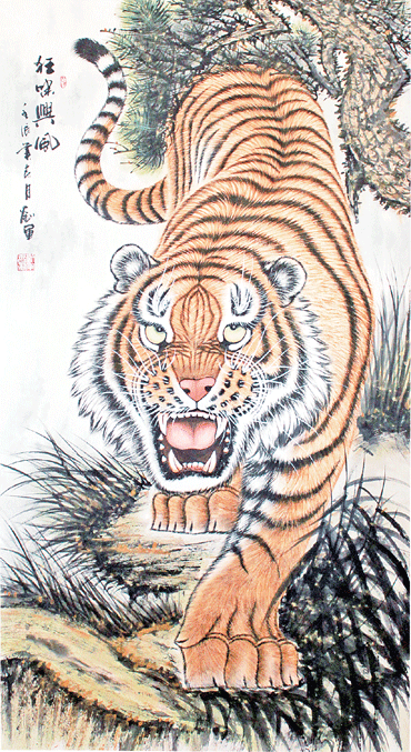 刘军在当代是画虎的佼佼者,称得上是专家。因为他不仅对如何画虎很有造诣,对虎的文化也有颇有研究。这得益于长期中国传统文化的津润和熏陶。刘军的虎气韵生动威猛,笔墨娴熟老辣,墨韵淋漓丰富。虎的造型结构明确,逼真而传神,尤其虎眼威而狡诈真实的表现虎的性情。刘军说:“百年虎是白色的,千年虎牙齿脱落头生角。……老虎出行前爪画地知冲破。可预知凶吉,虎真乃天生神物也”。如此神奇让听者闻所未闻。刘军虎系列作品受到海内外鉴赏家及收藏家青睐。