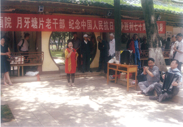 8月下旬,为纪念抗战胜利七十周年,昆明大观书画院与月牙塘片区老干部,特意选在星期日在公园露天长廊举办纪念抗战胜利七十周年书画展和演唱抗日歌曲活动。为防风雨损坏作品,老同志购买制作了六十公尺深色布料衬底的展线,展出以纪念抗战胜利为主题的精选作品七十件,其书法涵盖真草、隶、篆、篆刻;中国画涵盖山水、人物、花鸟等。合唱、独唱抗日歌曲二十二首,三十二名人均七十岁以上的老干部以丹青翰墨和响亮昂扬的歌声,满腔热情地颂扬党中央毛主席领导的八路军、新四军实行全民抗战取得的丰功伟绩,讴歌抗日统一战线中的中国军人、爱国将领、仁人志士在抗战中建树的不朽功勋。星期日展出一天,观众络绎不绝,数千人观看了书画展和围观演唱抗日歌曲,深受观众欢迎和高度赞赏,受到一次生动的爱国主义宣传教育。