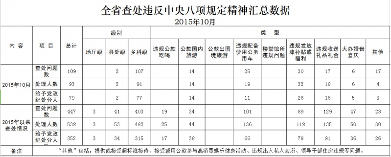 据云南省纪委省监察厅网站消息:201510月,全省各级纪检监察机关查处违反中央八项规定精神问题109起,处理93人,给予党政纪处分79人。