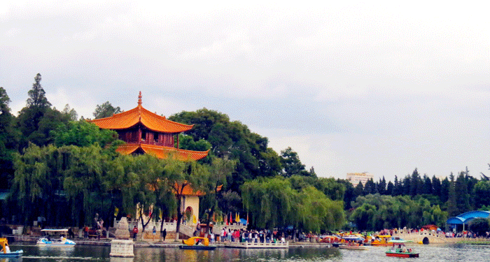 下联:小岛石韵,崴崴坚魂。千年虎峰敛楼台,万虚挂星衬河月。长联携楹门,古亭俨暗昧,邂逅台隍作词赋。思徸徸讲武戎马,金戈铁鞍。诮靓靓五华陈圆,却霸慕皇。印赤赤金殿铜瓦,灵筑雄章。忆浩浩汉武征南,庄驾文山。憾堂堂长伯削藩,成灭黄弦。数雄雄庄硚王滇,归秦置郡。地缘命中福,天昊运里财,气远常昭。狮山文帝隐身归佛,怒江红河玉溪。石林旖旎秀龙门嵎峦鹿扣丽江。奇亮如神擒纵抚蛮越泸沽。颂南诏赞可渡,七市八州载史册,保山国殇,和顺珺黄。彝人太阳历,禄龙白族茶,火把目瑙德宏瑞丽乡。版纳泼水名四海;普洱临沧纵谣歌;季春大理颂五洲;楚雄土火亮尘世。苍梅褔何往?三圣迎诸尊。南域胶林,建水文庙,哀牢俯瞰螳螂。西汤有情,腾冲安宁,三江并流惠通。东铜个锡,曲靖会泽,古爨碑颜珠源。北连丝路,迪庆中甸,昭通摩崖通衢。天拥地,地拥人,人拥天。天地人三才,圣杰经典。春城廓厦,原民板板开启,郑和蔡锷。滇中盘龙扎扎读耕,诗书继承。红军鹰翱翱飞越,丰功卓著,聂耳继尧。俊勾沉烈烈捐躯,将士精英。古往今来。万古夷滇高原魂魄才子佳人颂肝肠;千载俊灵垂功拓荒三迤,重阳护国,忠骨献大我宏真善。风骚独领。