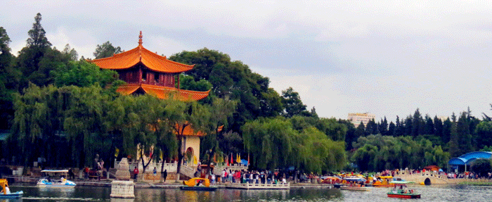 上联:大观河风,粼粼涟漪。万株苇葫连滇池,千帆浆船滉湖江。唐标立皋堤,铁柱锁鱼龟,临胜斗拱悬檐角。看彬彬游人扁舟,行乐从容。恍美美七岭卧佛,亭前梅花。略暖暖春意柔拂,苍烟夕照。望翠翠垂柳榆梢,草色蕉实。眺皑皑云卷霞舒,郭外尧天。瞭茁茁农禾茂丰,田园盛收。天晴奇雨曌,地润雾缭绕,鹤影神幻。涌泉绿水浮屿石峭,牛郎笛声婉悦。孤洲红土载湿地松郁秋宛萌荫。偶微滴似珍珠点摇竹稻浪。且碎银如童目,五黄六月滚塘荷,丹艳菊黄,小鸟依人。片云昼追日,残星夜映月,空宇鹞鹰登耸荡云阔。南屏暮鼓奏雅清;华亭禅锤敲澄明;五华晨钟响九宙;湖畔轻歌漫春宵。溪涧源何来?四合可随人。北山有约,蛇缠栖霞,蜿蜒太子戏珠。东峰骏骢,肩摮行囊,五行迁徙跟斗。西烟拥枫,影涨潮落,廷兵混战穹窿。南舞素绫,玄奥琼阁,菩萨下凡拂尘。云抱山,山抱水,水抱云。云山水鼎缘,奇颜裹素。内海沼泽,藕莲婷婷玉立,丹顶白鹳。草外鸳鸯滚滚俏游,渔歌互答。红嘴鸥翩翩翔跃,鸟语花香,赤鸭孔雀。亮窈台幢幢极巅,民居墅宅。目览无涯。一派惠和青山湖光隽色美域展风情;一幅海瑞祥气清秀七彩,疆陲迂逦,婉仪展水墨生画景。举世无双。