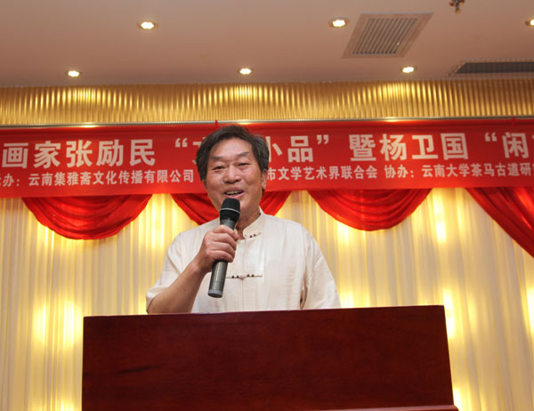 昆明市政协副主席、云南长城书画院顾问汪叶菊女士发表讲话,对张励民先生和杨卫国先生的作品表示认可和肯定,张励民是书、画、诗三杰。云南书画院研究员、省楹联学会副会长韩先成对这次展览作了热情洋溢的发言。张励民先生对自己的作品和成就作了回顾和讲解。云南省人民政府参事、云南长城书画院顾问李森宣布展览开幕。本次展览规模宏大,气氛热烈。