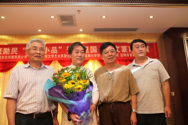 书画家张励民(左二),篆刻家杨卫国(左一),云南书画院研究员、省楹联学会副会长韩先成(右二),云南集雅斋文化传播有限公司董事长、书画装裱师宁厅功(右一)在会场上